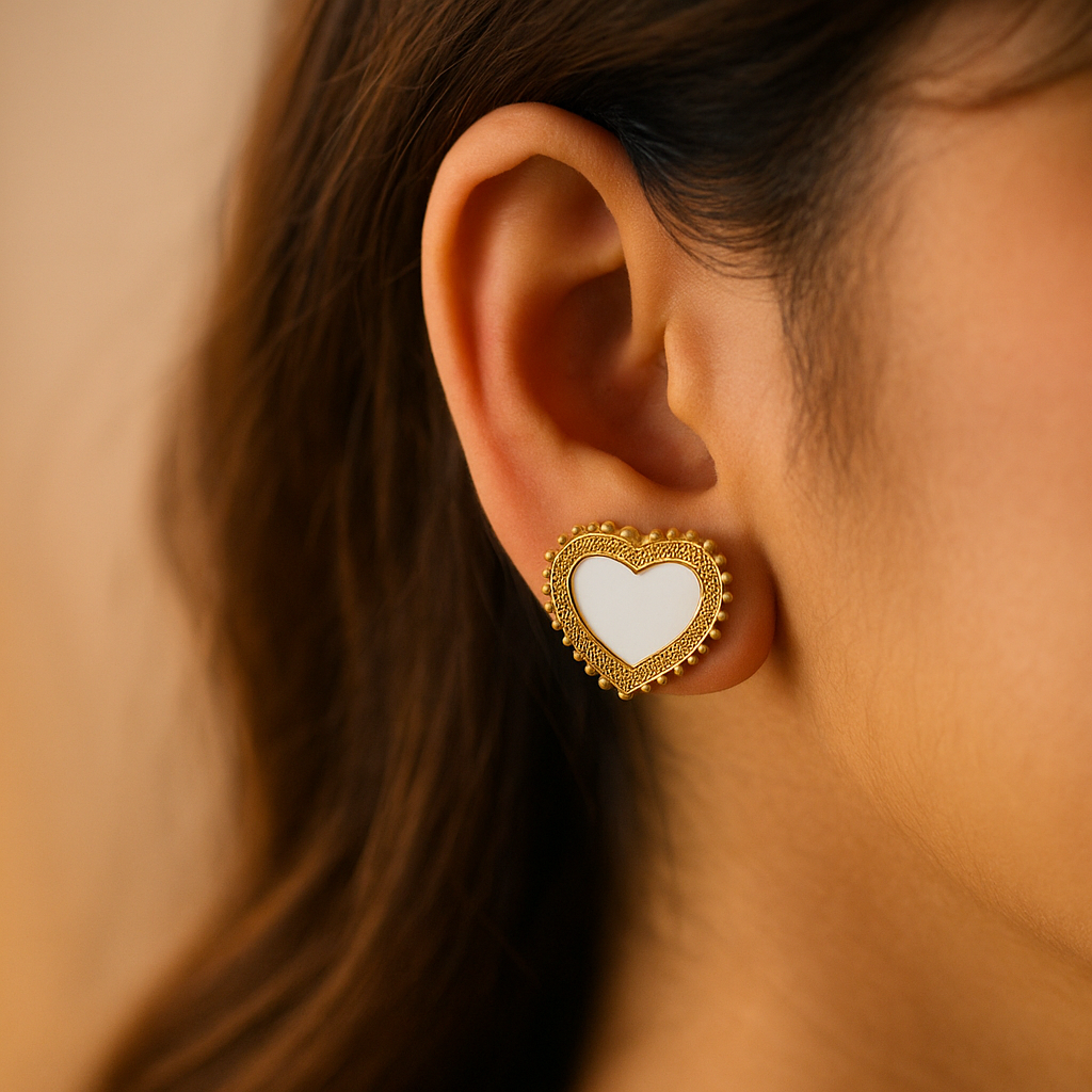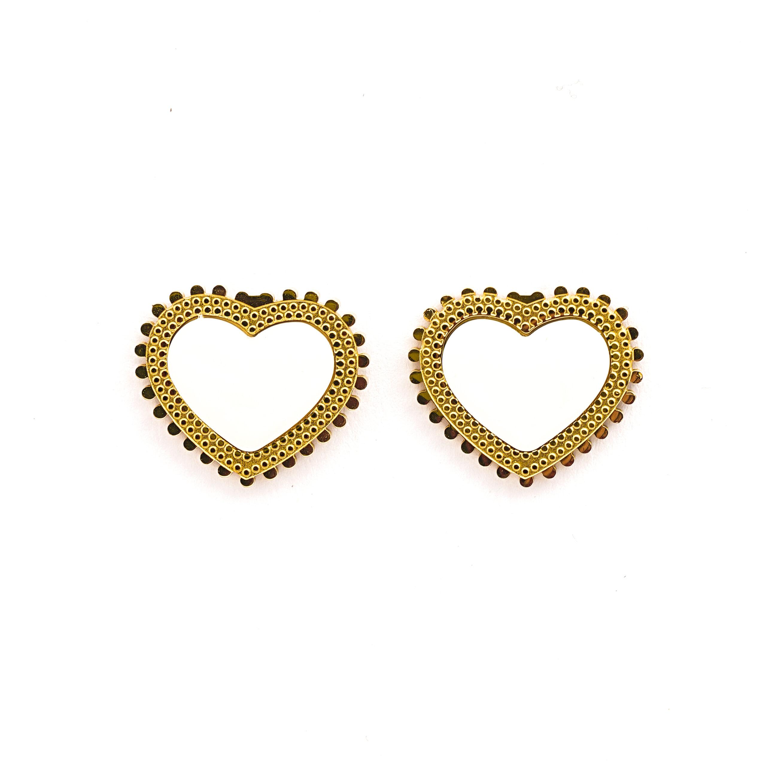 An open heart shape with intricate dot-texture detailing and a subtle white-stone accent. These earrings offer a mix of romance and sophistication, making them a great gift or a chic daily wear option. Lightweight yet eye-catching, they bring a playful elegance to any look.
