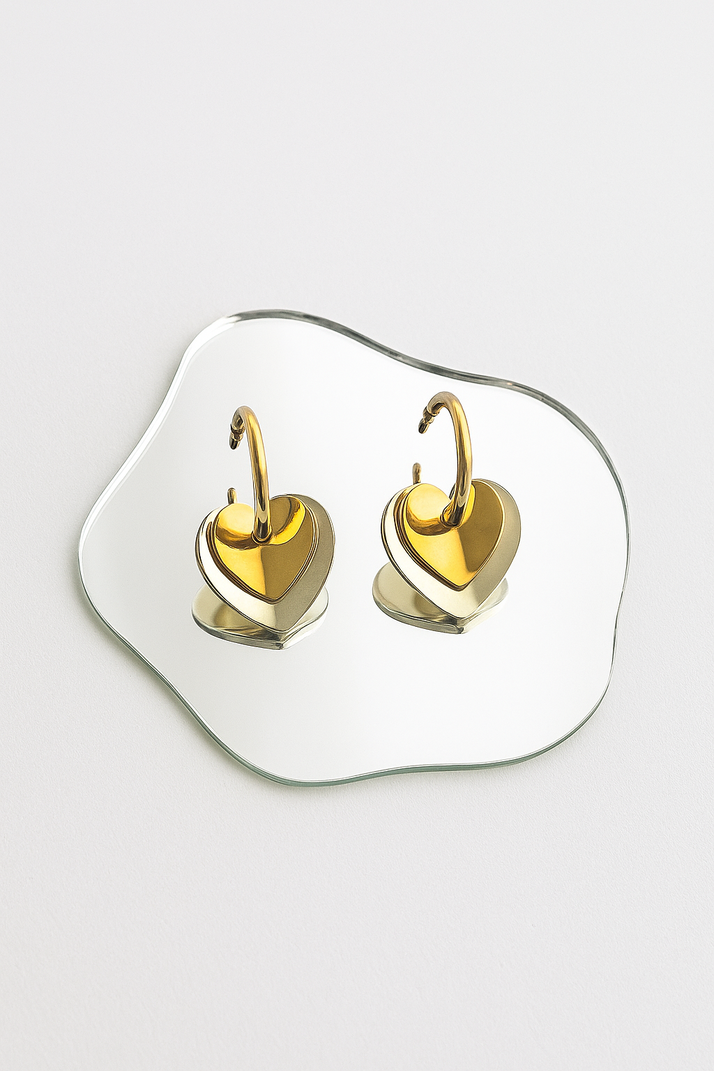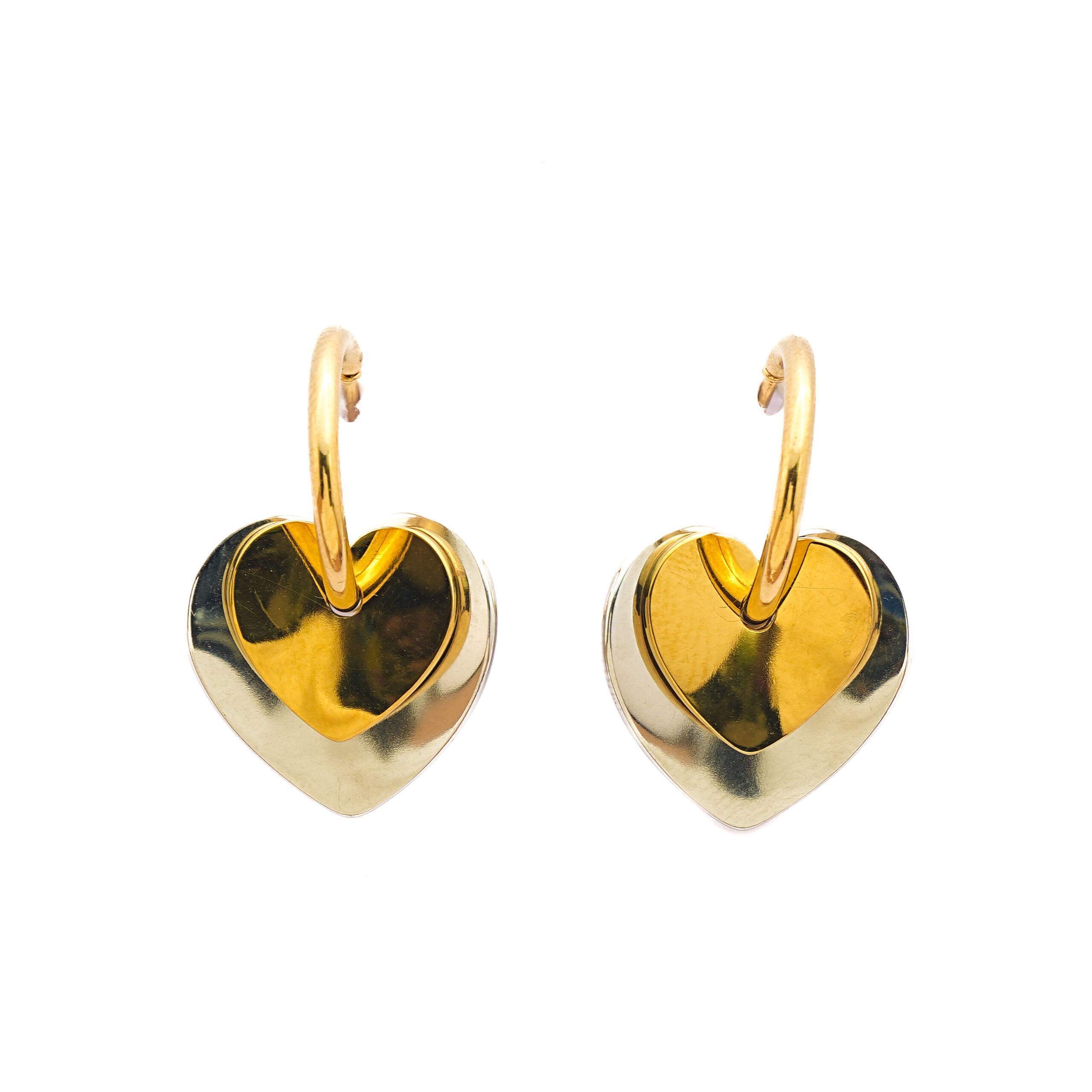 Sleek gold hoops with nested silver-toned heart charms — a stylish fusion of tones and tenderness. These earrings bring a playful swing and a modern twist to classic romantic motifs.